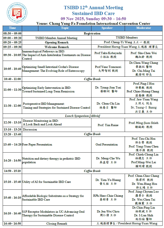 歡迎各位參加台灣發炎性腸道疾病學會2025年年度會議。